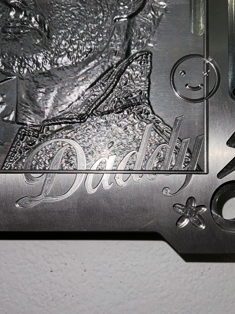 Formal spielt die Arbeit mit Kontrasten: Die Oberfläche aus massivem Hartmetall erinnert an industrielle Stanzwerkzeuge – ein Verweis auf klassische Männlichkeitscodes. Gleichzeitig zieren das Objekt symbolhafte Ornamente wie Herzen, Sterne und Schmetterlinge, inspiriert von mädchenhafter Teenie-Ästhetik und digitalen Stickerwelten.