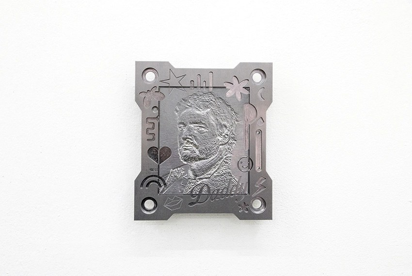 Auseinandersetzung mit zeitgenössischer Männlichkeit. Im Zentrum steht ein CNC-gefrästes Portrait des Schauspielers
