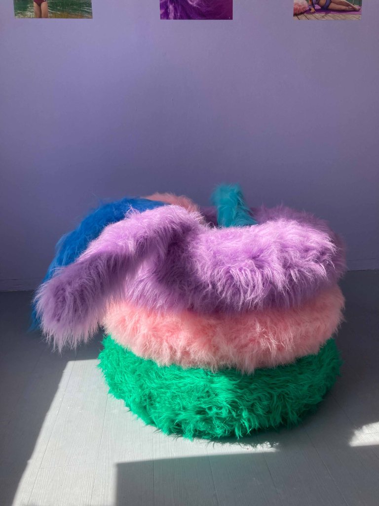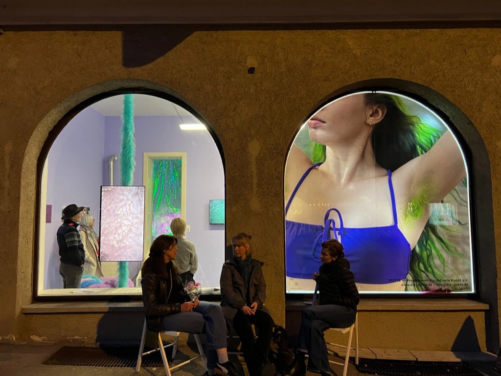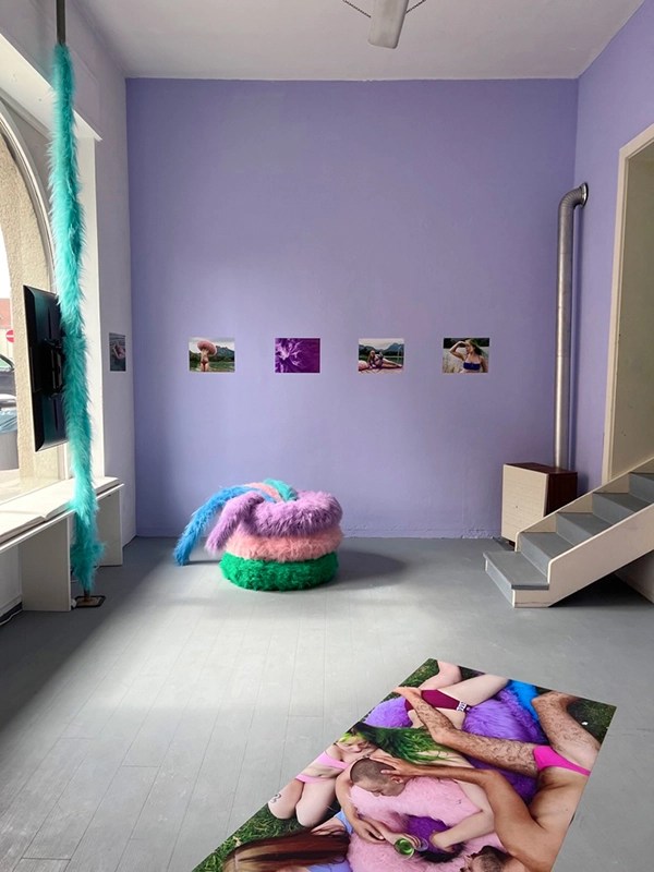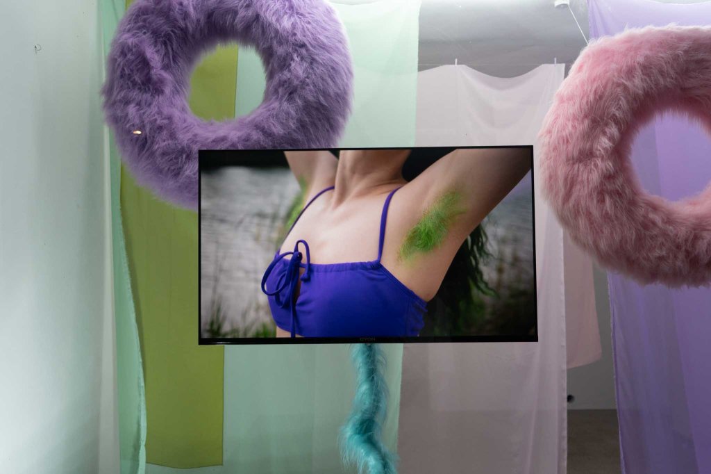 Bodys in Bloom; Hairy Girl* Summer; 2024, Austellungsansicht, Die Putte, Neu-Ulm, Backlit Folie, Life Size Print, Screens, Schwimmringe und Schwimmnudeln mit Stoff bezogen, Stoffbahnen, Ventilator, Sound, Fotoprints