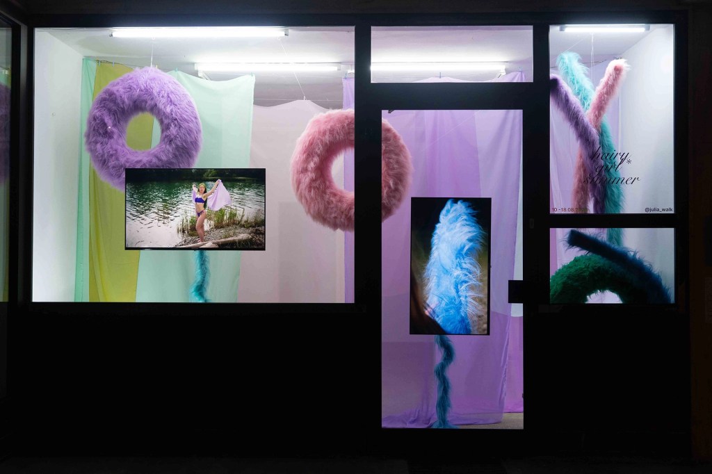 Ihre Arbeiten sind laut, farbenfroh und machen Spaß. Julia Walk ist immer Teil ihrer Installationen und Performances, inszeniert ihren eigenen Körper und reflektiert damit nicht nur ein gesellschaftliches Körperbild in der