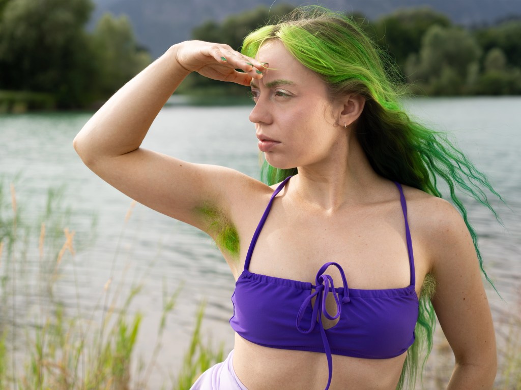 selbstbewusste Präsentation. In ihrer Arbeit Hairy Girl* Summer posieren vier Personen an einem sommerlichen Badesee.