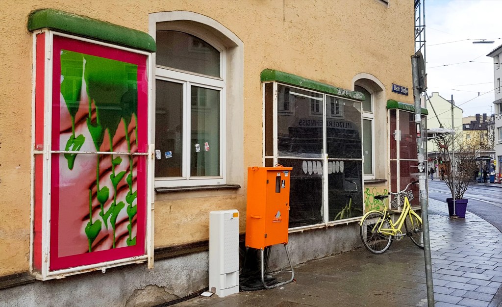Green Sugar; 2020, Digitaldruck auf Backlit Folie, LED, Powerbanks, Installationsansicht bei Tag und Nacht, Ille Galerie #3, München
